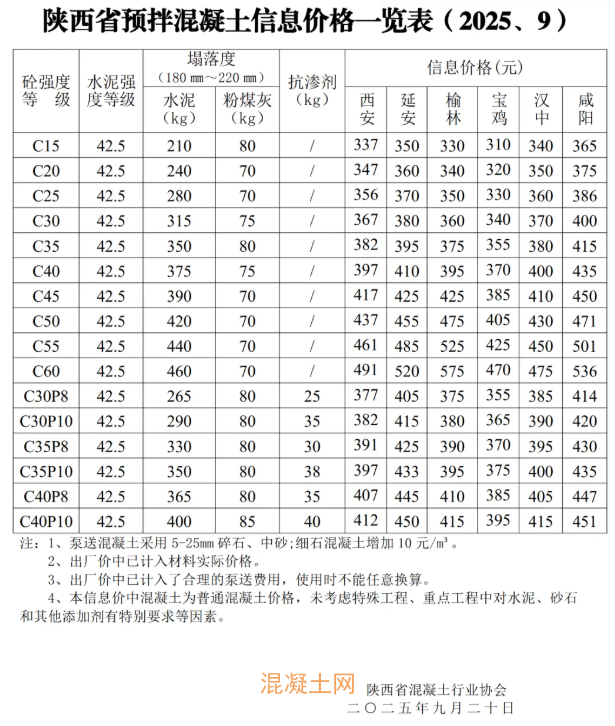 陜西省預拌混凝土信息價格一覽表(2025、9)