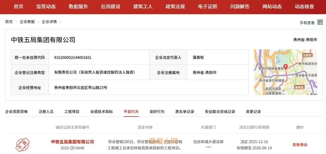 據經濟參考網1月8日消息,日前,全國建筑市場監管公共服務平臺信息顯示,中鐵五局集團有限公司(以下簡稱“中鐵五局”)被住房和城鄉建設部實施停業整頓180日,決定時間為2025年12月16日,有效期至2026年6月14日。停業整頓期間,不得以建筑工程施工總承包特級資質承攬新的工程項目,涉及的具體事由未公開。