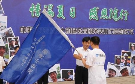 隨后,張建國總經(jīng)理鄭重的將服務旗幟送到服務分隊隊長馬英武的手中,隨著張總發(fā)布服務分隊出發(fā)的命令,數(shù)輛中聯(lián)售后服務車徐徐駛出,載著中聯(lián)對客戶的感恩和真誠,奔赴全國12個省的各個服務區(qū)域……