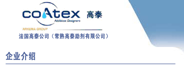 總部位于法國熱奈法國高泰公司是一家全球領先的水性外加劑生產廠家,隸屬于法國阿科瑪化工集團。目前在全球14多個國家和地區擁有自己的生產產能,銷售團隊和研發隊伍。全球范圍已獲得 ISO 9001-2000認證。2009年法國高泰進入中國,并成立常熟高泰助劑有限公司。