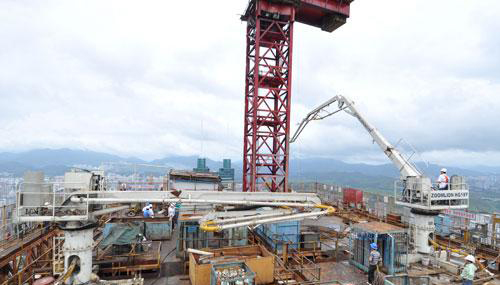 項目部經理令狐延對中聯混凝土輸送泵信心十足:“兩臺中聯HBT90.40.572RS超高壓混凝土輸送泵已經為京基金融中心項目泵送了從C40到C80不等的近80000立方米混凝土,而越往高層混凝土的標號將逐漸升高,特別是創造超高性能混凝土超高層泵送世界記錄的C120混凝土,也將在這個時候開始使用。目前中聯兩臺輸送泵運作良好,相信新的世界記錄將順利誕生。”