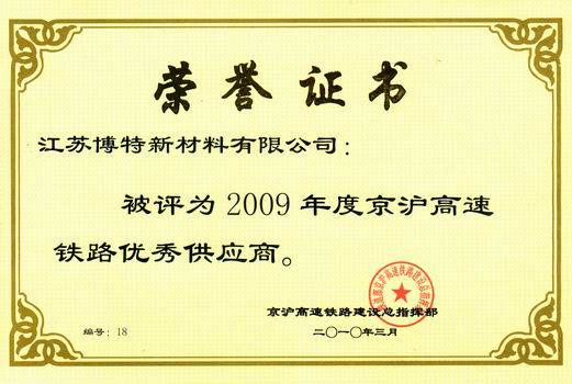 近日,江蘇波特新喜獲“2009年度京滬高速鐵路優秀供應商”稱號。該榮譽是鐵道部京滬高速鐵路建設總指揮部對江蘇博特新材料有限公司優異的產品質量、良好的服務信譽給予的充分肯定,對保持和擴大“SBT®”品牌在軌道交通領域的影響以及橋梁產品的推廣應用等方面都將起到積極的促進作用。