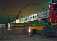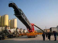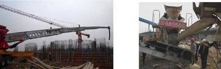 2010 年11 月27 日,也就是接車的第二天,皮帶輸送車就開(kāi)赴中天鋼鐵工地進(jìn)行煉鐵爐的基礎(chǔ)的混凝土澆筑。工地上看到這個(gè)新式裝備都很好奇,當(dāng)正式開(kāi)始施工時(shí),皮帶機(jī)速度快的優(yōu)勢(shì)就很快體現(xiàn)出來(lái)了。皮帶車的皮帶速度是可以調(diào)節(jié)的,根據(jù)工地需求一開(kāi)始把輸送的速度有意放慢了一點(diǎn),這時(shí)每清空一臺(tái)9 方車的速度為4 分半鐘,(合每小時(shí)120方),隨后皮帶速度調(diào)快,每清空一臺(tái)9 方車的速度僅為3 分鐘,(合每小時(shí)180方),皮帶機(jī)的速度能夠很好地滿足工地的需要,由于皮帶機(jī)的工作速度極快,攪拌車放下的料馬上就能被輸送出去,所以在工地上經(jīng)常能看到2 臺(tái)罐車同時(shí)給皮帶機(jī)供料的情況。在這工地上皮帶機(jī)一次性連續(xù)布料混凝土量為2400 方。