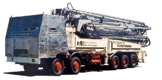 (圖為1986年普茨邁斯特長臂架混凝土泵車在前蘇聯切爾諾貝利核電搶險,通過在幾百米外遠的固定式混凝土泵上料,或者如圖示直接由攪拌車上料。)