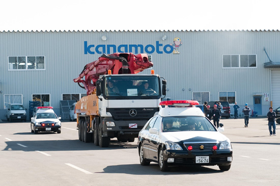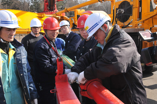 該臺泵車是3月24日上午到達日本大阪港的,在設備到達日本后,三一重工三名工程師對設備進行檢查、確認后,在警車護送下前往千葉縣培訓場。3月25日、26日兩天,三一服務工程師對東京電力操作人員進行緊急培訓,并進行模擬打水測試。3月27日上午,在完成泵車管路緊固以及底盤和上裝的全面檢查后,泵車離開千葉訓練場,開赴最后的目的地——福島第一核電站。