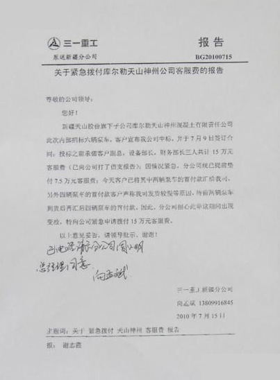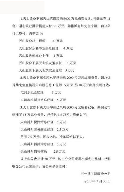 照片顯示,2010年7月份,天山股份下屬天山筑將采購8000萬元成套設備,三一重工向天山股份總工程師、天山股份東疆事業部總經理、天山股份招標辦主任以及天山筑友董事長和總經理5人共計支付了30萬元;天山股份下屬屯河水泥已采購2000多萬元成套設備,三一重工向天山股份總工程師支付了15萬元,三一重工新疆公司向屯河水泥總經理及攪拌站總經理各支付了5萬元;天山神州已采購2000多萬元成套設備,三一重工向攪拌站總經理、天山神州常務副總經理及銷售部長共支付15萬元。報告稱三項業務費共計70萬元,均由三一新疆分公司或周小明先生已墊付。