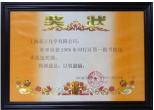 上海花王化學公司自生產(chǎn)開始以來,隨著逐年增長的生產(chǎn)量,能源消耗也隨之增大,因此上海花王公司從2008年開始,全公司一起為節(jié)能減排而出謀劃策。在進行了一系列整改措施后,至2009年,公司被上海閔行區(qū)經(jīng)濟情報委員會授予“2009年閔行區(qū)節(jié)能技術(shù)改造獎”獎。2009年9月中國上海閔行區(qū)經(jīng)濟情報化委員會經(jīng)過政府派遣專家進行數(shù)次實地考察核審,最后決定授予上海花王化學有限公司“2009年度閔行區(qū)第一節(jié)能改造項目獎”。上海花王化學因?qū)α蛩峄破返呐艧峄厥崭叱鲈瓉淼?%,并在一年間減少CO2排放量903噸的成果而受賞。2010年7月獲得“上海節(jié)能獎”,這個獎項是頒發(fā)給二氧化碳減少1300噸以上企業(yè)的。