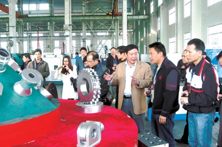 會談結束后,各位來賓在集團副總經理劉忠的陪同下乘車參觀了集團的各生產分廠和生產車間,并下車參觀了建設機械二廠、起重機械分廠,詳細了解了產品的生產制作工藝和生產流程。另外,還參觀了煙臺大韓美味香糧油有限公司、煙臺方圓大韓制粉有限公司和煙臺金鼎葡萄酒業有限公司三大新興產業,并登上方圓誠信金鼎,參觀了金鼎博物館內集團的發展歷史圖片資料,了解了集團的發展史和富有特色的企業文化。