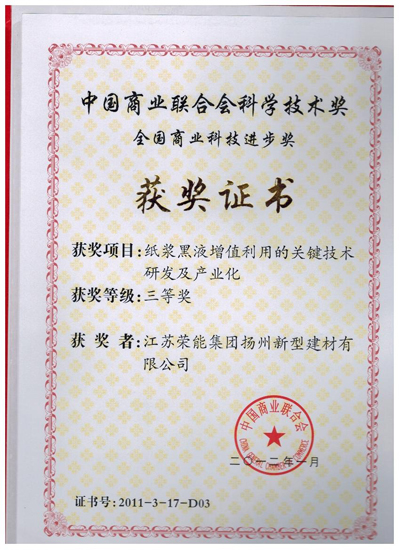榮能集團申報的項目“紙漿黑液增值利用的關鍵技術研發及產業化”被授予“全國商業科技進步獎”三等獎。