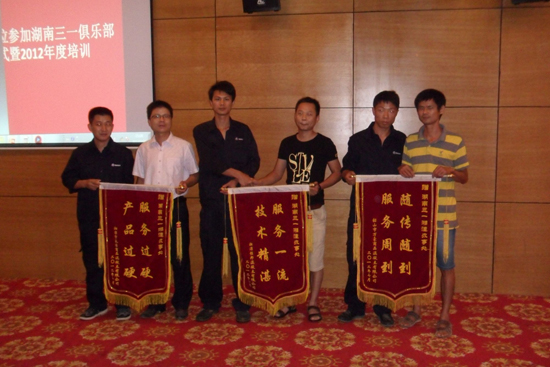 此次培訓分為五個部分:主持人演講、領導致開幕詞、客戶授旗儀式、服務技術交流會議、現(xiàn)場提問及頒獎、答謝晚宴。活動伊始,由本次活動的主持人湖南三一客戶管理專干張蓉發(fā)表演講。她以“場內(nèi)高朋滿座花更艷,場外艷陽高照天更藍”作為開場白拉開了活動的序幕,熱烈歡迎到場的各位嘉賓,表達了湖南三一對客戶支持的由衷感謝。演講完畢,由金智輝先生致開幕詞。他聲情并茂地介紹了我們?nèi)恢毓そ谌〉玫母黜棾煽儯⒈磉_了對蒞臨會場的各位嘉賓的誠摯歡迎。他指出,為了更好地為客戶服務,進一步提升我們的品質(zhì),特成立湖南三一俱樂部,為廣大客戶提供一個可以交流、互動、學習、促進的平臺,秉承三一“品質(zhì)改變世界”歷史使命,將為打造工程機械行業(yè)和商品混凝土行業(yè)的先鋒而做出最大的努力。其熱情的演講,活潑生動的語言打動了現(xiàn)場的每一位來賓,將整個會議現(xiàn)場的氣氛推向第一個高潮。