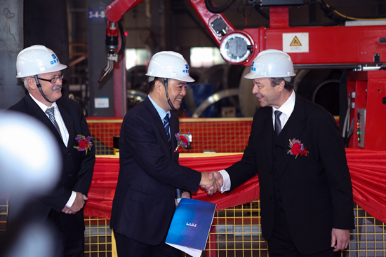 2012年10月24日上午,眾多媒體記者、企業代表齊聚在中聯重科混凝土機械公司沅江工業園,見證了中聯重科攪拌車攪拌筒內焊縫焊接機器人生產系統的正式啟用。該系統的使用在國內混凝土機械行業尚屬首次,它的投產集中體現了企業一流自動化生產能力和出眾的制造技術實力。中聯重科副總裁、混凝土機械公司總經理陳曉非,德國徠斯機器人有限公司Kroth博士、Emontz博士出席啟動儀式并剪彩。