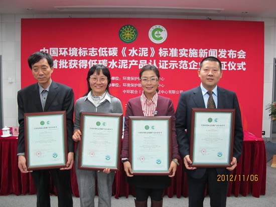 2012年11月6日,中國環境標志低碳水泥標準實施新聞發布會暨首批獲得中國環境標志低碳水泥產品認證示范企業頒證儀式在環境保護部環境發展中心正式召開。拉法基瑞安旗下四川都江堰廠、重慶南山廠和地維廠、云南富民廠以及其他10家水泥廠在此次發布會上獲得中國環境標志低碳水泥產品認證示范企業稱號,成為首批獲此殊榮的企業。環保部科技標準司、科學技術部社會發展司、中國建筑材料科學研究總院以及水泥協會和環境認證中心的領導出席了此次新聞發布會,并為獲得認證示范企業的單位頒發了低碳水泥標志。