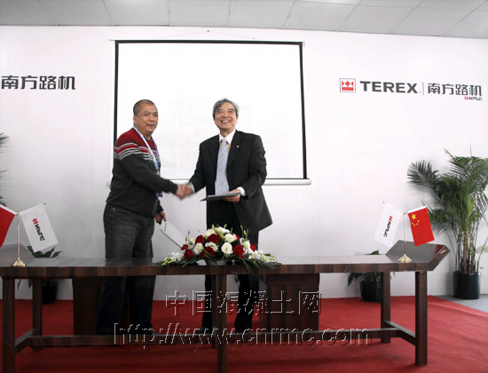 圖為南方路機董事長方慶熙(右)與順裕(龍巖)混凝土公司董事長鄭長征(左)簽定合作協議