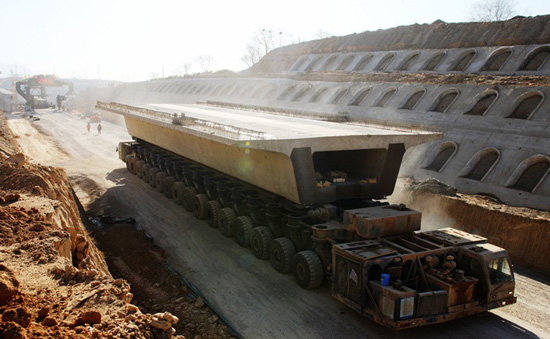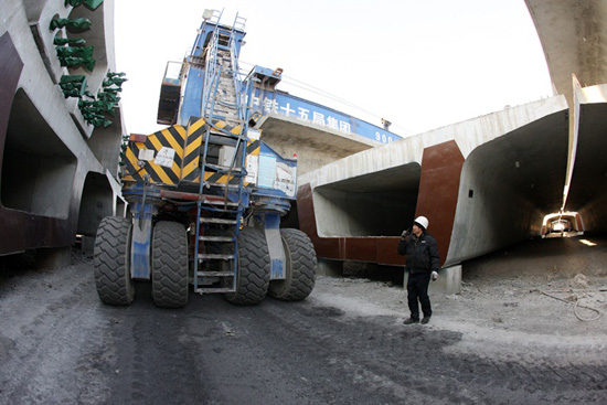 風聲、運梁車蠕動發出的轟鳴聲與鄰近村子傳來的鞭炮聲,遙相呼應,使這個地處晉中平原邊遠的小山村變得格外的熱鬧。900噸架橋機上下舞動,頂著零下20多度的低溫往來穿梭的建設者,與兩岸村民房前屋后鮮紅的彩燈相映成趣,構成了人與自然、傳統與現代和諧的交響!第一次看到高大的運架梁等大型設備的村民們興高采烈,相互談論著這個比他們家的房子還要大的運架梁設備的感受,談論大西客運專線將會對他們的生活帶來的新變化……有位60多歲的老人指著大型運架機械問他年僅6歲的孫兒長大后能不能也開上這樣的機器,載著他們家的房子去進城!這是元旦前夕在建設中的大西客運專線南莊特大橋900噸箱梁架設工地看到的情景。