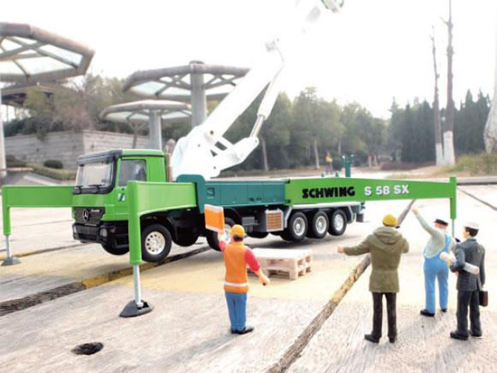 可以說,施維英和CONRAD都是“一根筋”的德國企業,執著的CONRAD為執著的施維英制作模型,實乃絕配。而這款施維英58SX混凝土泵車模型也正是CONRAD的經典之作——它是CONRAD制作過的最大臂架長度的泵車模型,原型車即參建過國家大劇院、鳥巢施工,采用奔馳底盤,涂裝為施維英一貫的綠白色,整體用料扎實、分量極重,但CONRAD模型做工只求神似,因此一些細節方面倒是簡而化之,配件也不多。