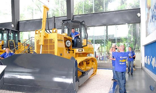 波蘭柳工公司勞動標(biāo)兵興奮地在公司產(chǎn)品展廳留影