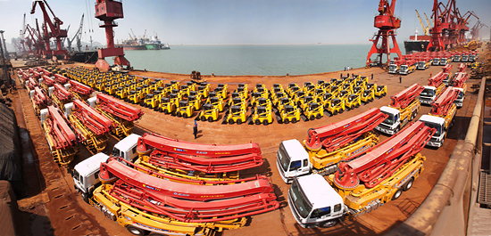 4月17日,在連云港港口,60臺(tái)徐工混凝土泵車和122臺(tái)徐工滑移裝載機(jī)身披紅花整齊地排列披紅掛彩,一字排開,氣勢(shì)宏偉,這是V58項(xiàng)目發(fā)出的第三批產(chǎn)品。徐工先期向委內(nèi)瑞拉交付的產(chǎn)品已在委內(nèi)瑞拉安居房、道路、橋梁等建設(shè)中顯示了優(yōu)越的性能,受到了當(dāng)?shù)鼐用窈驼母叨荣潛P(yáng),對(duì)于當(dāng)?shù)亟ㄔO(shè)發(fā)揮了巨大作用。
