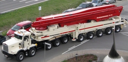 普茨邁斯特公司采用半掛車作為底盤,使得該泵車具有良好的移動性,其轉彎半徑甚至小于18米,完全能適應公路及工地行駛。得益于這種設計,世界上最長臂架泵車的靈活性一點也不比小型泵車差。RZ折疊型5節臂布料桿能在53米高度形成17米的水平布料半徑,大大超出任何其它泵車的布料范圍。當在狹窄場地操作時,巨型布料桿能在泵車的支腿支撐范圍內展開。泵送時,拖車仍和掛車緊密連接,起到平衡重心得作用。
