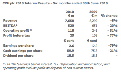 CRH的行政長官M(fèi)yles Lee說:“從7月7日數(shù)據(jù)更新以來,歐洲市場雖然仍有不確定性存在,但其已達(dá)到的經(jīng)濟(jì)指標(biāo),這令人鼓舞,但是在美國市場則不盡如人意。美洲的各項(xiàng)業(yè)務(wù)指標(biāo)都低于預(yù)期量,而各項(xiàng)的競爭力都低于其他同行公司。因此在我們在未改進(jìn)之前,預(yù)測下半年美洲的材料市場盈利將低于去年。全年歐元合并統(tǒng)計(jì),先前所預(yù)測的稅息折舊及攤銷前利潤下半年將超過2009年,將不可能實(shí)現(xiàn)。從我們目前的預(yù)期來看,集團(tuán)較2009所生產(chǎn)的18億美元,今年的稅息折舊及攤銷前利潤將呈現(xiàn)約10%的下降。有了這樣的負(fù)債預(yù)算,集團(tuán)已做好準(zhǔn)備應(yīng)對挑戰(zhàn),下半年將繼續(xù)把重點(diǎn)放在降低成本上?!?/P>