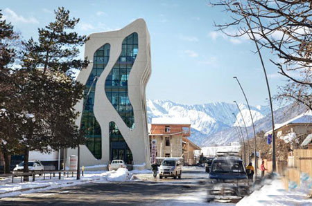 大樓的立面用穿孔混凝土板材建造,并設(shè)置了大塊的開口,增加了樓身的透明度。從混凝土框架望出去是高加索山脈的美麗景色。