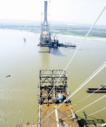 武漢天興洲長江大橋是我國首座四線公鐵兩用斜拉橋,其504米主跨位居世界同類橋梁之首,大橋荷載也列世界第一。截至昨日,2號與3號主塔之間主跨的整節段鋼桁梁架設已經過半,預計7月合龍,8月全橋貫通。