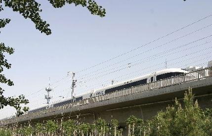 2008年5月30日,一列動車在京津城際鐵路北京城區的線路上運行測試。京津城際鐵路是我國第一條時速300公里的客運專線,今年8月奧運會前將如期投入運營。在全長120公里的京津城際鐵路是,列車最高時速將達300公里,北京、天津間列車全程直達僅需30分鐘。