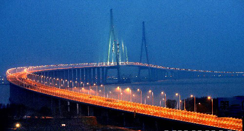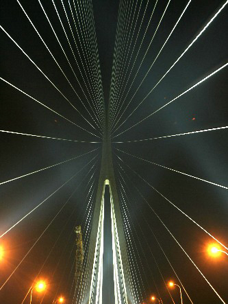 2008年3月5日蘇通大橋亮燈3月4日晚拍攝的蘇通大橋夜景。當(dāng)日,蘇通大橋進(jìn)行景觀亮化工程安裝調(diào)試。全長32.4公里的蘇通大橋位于江蘇省東部的南通市和蘇州的常熟市之間,東距長江入海口108公里,是國家高速公路沈陽至海口通道和江蘇省公路主骨架跨越長江的樞紐工程。