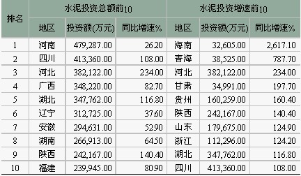 從各省投資增速來看,增長最快的前10大水泥投資增速均在100%以上,前5名均超過150%,其中海南、青海、甘肅三省由于原投資基數較小,導致水泥投資增長速度較快。