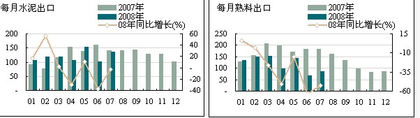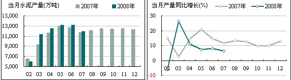 全國1~7月份水泥累計產量76,745.80萬噸,同比增長8.30%,累計增長速度超過25%的有內蒙古、天津和黑龍江省,產量分別增長了26.78%,26.54%,26.40%;受奧運限產停工影響,北京的累計產量同比增長速度居全國末位,為-6.96%,僅7月份當月北京市的水泥產量環比下降38.76%,同比下降43.26%。
