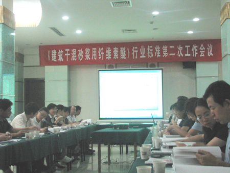 2008年9月19日由北京建筑材料科學研究總院負責組織起草的《建筑干混砂漿用纖維素醚》行業標準第二次工作會議在北京瑞馳大酒店召開。會議由北京建筑材料科學研究總院段鵬選教授主持。會議在聽取標準起草組匯報標準編制過程和編制說明等內容,進行了認真細致的審查與分析。