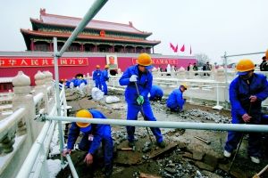 昨日(18日)下午2時,天安門前金水橋東西兩側的“品級橋”橋頭,已設2米多高的青灰色圍擋。東側的“品級橋”上,20多名佩帶天安門管委會施工工作證的工人,手持鐵錘和鑿子席地而坐,一點點“開墾”著橋面。據橋頭的安全員說,由于橋面空間較小,限制了進場施工人員數量,工人已分為兩班晝夜施工,保障工期。