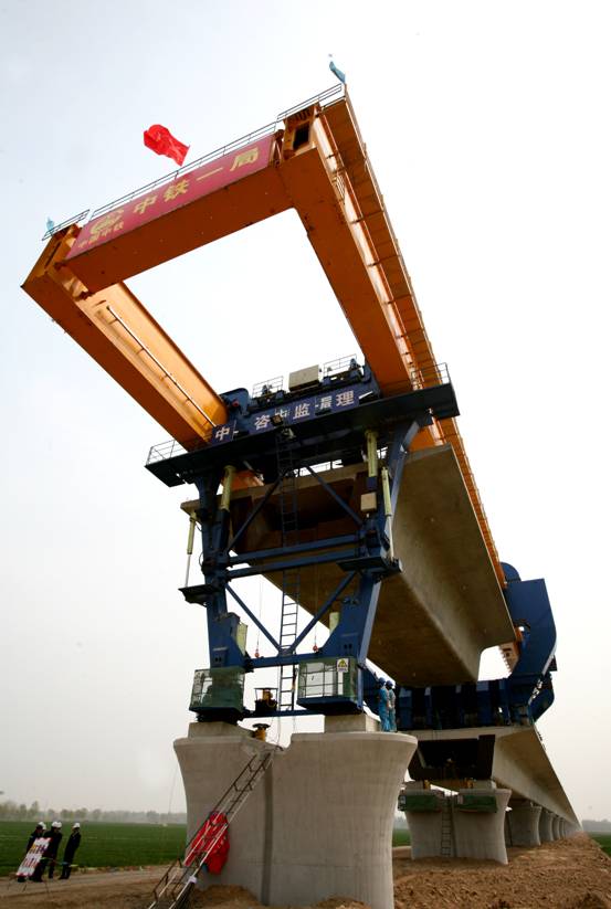 2009年以來,承擔京滬高速鐵路土建二標段德禹特大橋、禹濟特大橋和黃河特大橋共計2476孔箱梁架設任務的新運公司京滬高速鐵路架梁項目部,認真落實鐵道部 “六個確保”年度目標和全線各節點工期要求,廣泛開展了“高揚黨旗建高鐵,標準高效創一流”主題活動和“比日產,創高效,搶進度,奪全勝”勞動競賽活動,多措并舉,四點同架,不斷掀起架梁高潮,使架梁進度以平均日架10-12孔的高速度穩步向前推進。并在施工中先后創出了單機日架整孔箱梁6孔和四機六班日架整孔箱梁16孔的高產記錄。截止4月7日18時,該項目部已順利完成整孔箱梁架設455孔。
