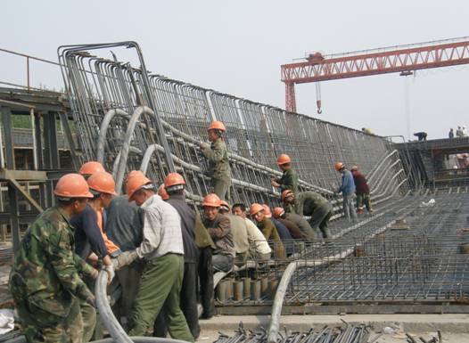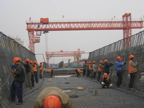 技術創新、加快施工進度。京滬各梁場在嚴格執行現場質量管理制度、工序質量責任制,關鍵工序質量保證措施的同時,積極開展技術創新活動,采用新工藝、新工法和梁體質量通病預防措施,不但提高了工程質量,而且提高了工效,加快了施工進度。在梁身鋼筋綁扎施工中,在濟南指揮部和局項目部的指導幫助下,對箱梁預應力孔道實行定位工法,對定位網進行改造,方便了管道順直固定,使加工制作和安裝預應力網片簡捷方便,將工效提高了將近一倍;對端模進行了改造,在錨穴外沿設置一定的弧線段,既方便了端模拆除,又保證了梁體端頭外觀質量;對梁體混凝土澆注施工方法進行技術創新,總結出對于大噸位大體積箱梁混凝土灌注的最優方案,減少了梁體空洞發生;為了消除梁體混凝土氣泡質量通病,項目部嚴格控制混凝土的坍落度,有效減少了氣泡,保證了混凝土強度。同時還對了克服支座板空響、橋面六面坡的施工工藝進行了優化,有力的保障了施工的質量和進度,受到局項目經理部和濟南指揮部的書面表揚。
