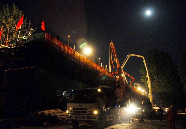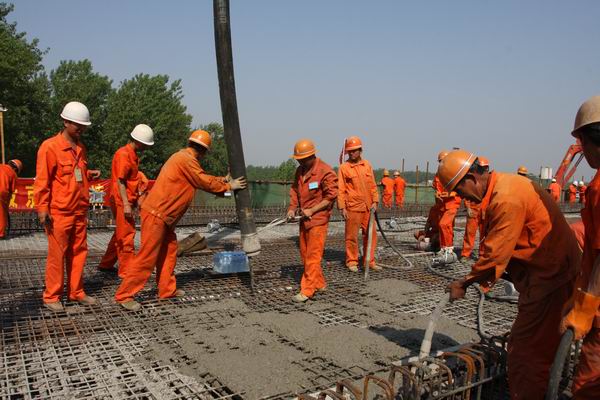 為使現澆梁順利澆筑,在施工前該單位就做了精心準備和具體部署。一是召開八丈溝澆筑前施工準備會。集團公司副總經理兼京滬高鐵指揮部指揮長、黨委書記習仲偉和常務副指揮長張玉軍等指揮部領導到會并提出具體安排,要求對技術和現澆梁施工人員進行全面培訓及到別的單位進行觀摩學習,使得每一位員工在思想上引起高度重視,明確自己所在崗位的重要性及在施工過程中要掌控的關鍵環節。二是制定了專項施工技術方案和準備。七公司副總經理兼京滬高鐵項目部經理許滌非、項目書記董恩情、總工王繼東等率領項目部一班人馬按照局指揮部的要求,精心組織,合理分工,從混凝土澆筑前對支架、模板、鋼筋和預埋件的全面檢查,到振動棒的移動間距,以及混凝土收漿抹面的人工拉毛、養生等進行詳細的分工和安排,并是制定了專項安全措施,成立安全領導小組,專門設計安全欄桿、腳手板、爬升梯和安全網,施工現場設置隔離欄桿和醒目的標志牌、限速牌,夜間設置指示燈等,并成立了后勤保障組以及時為施工人員送上可口的飯菜。