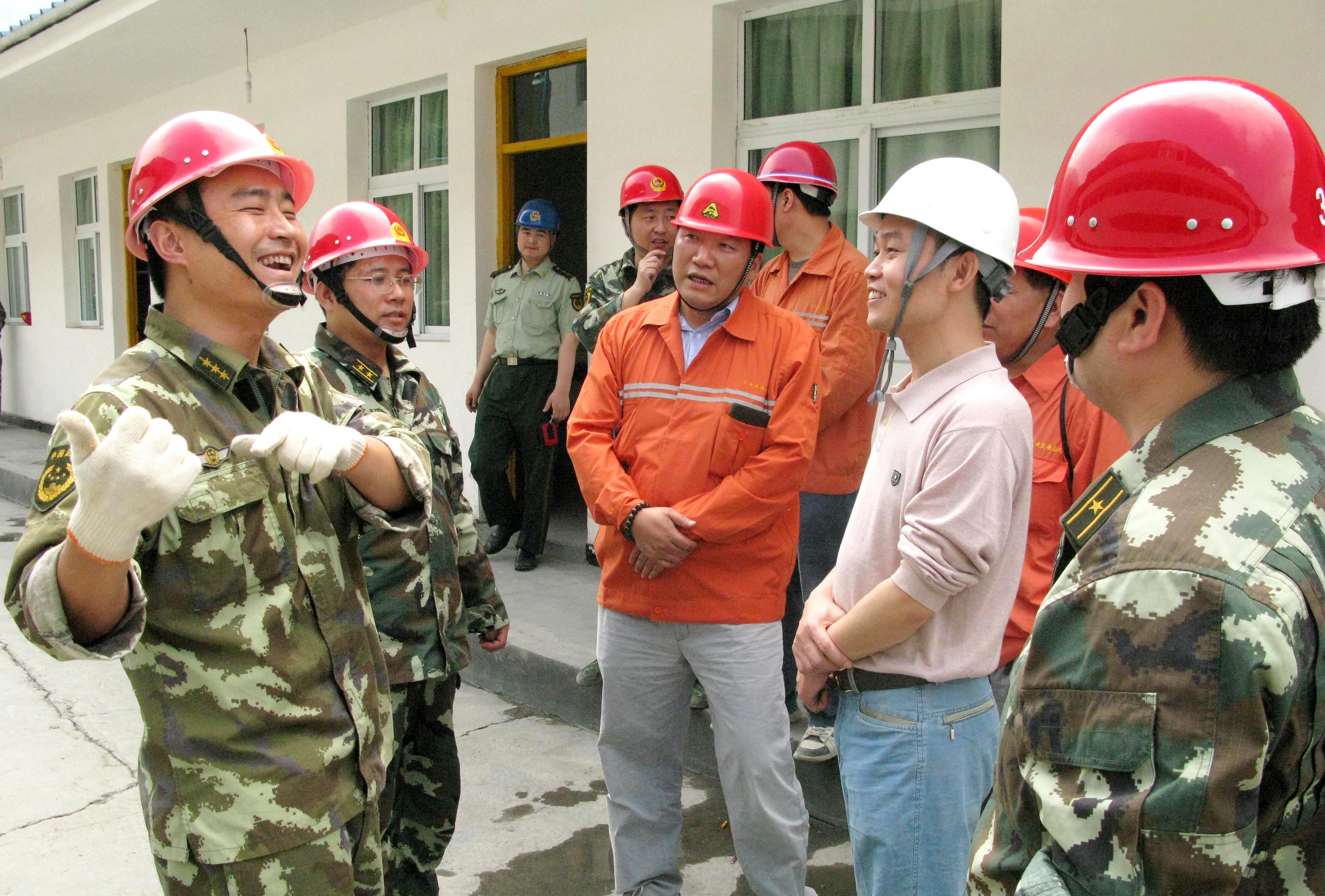 現(xiàn)場(chǎng)救援演練總指揮、項(xiàng)目部教導(dǎo)員夏義勇(左一)、副總指導(dǎo)張立國(guó)、李剛(左二)等與中國(guó)三峽總公司及三峽發(fā)展公司相關(guān)部門(mén)負(fù)責(zé)人分析、交流應(yīng)急演練情況