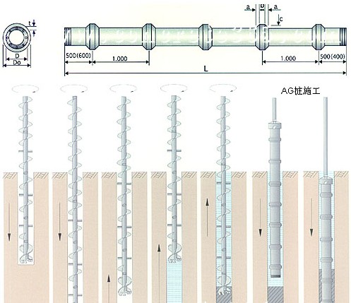 為了將管樁的側摩阻力提高到最大,他們發明了竹節高強度預應力混凝土管樁AG,由于這種管樁的外形是變截面的,它克服了預應力混凝土管樁表明光滑摩擦系數小的缺點,增加了與土壤的摩擦阻力(釘子與螺絲釘的比較),并且用無噪音無損傷的沉樁方法,大大的提高了單樁承載力(見下圖)。