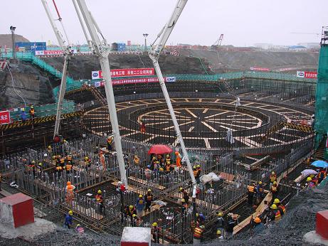 此次澆注繼續(xù)采用我國(guó)在世界上率先掌握的大體積混凝土一次性整體澆注技術(shù),并進(jìn)行了一系列改進(jìn):核島底板表面增加了混凝土抗裂鋼筋;混凝土配合比進(jìn)行了優(yōu)化;在混凝土表面覆蓋薄膜保濕養(yǎng)護(hù);在溫差變化大和外部約束大的部位設(shè)置溫度應(yīng)力監(jiān)測(cè)點(diǎn);在本次混凝土澆筑期間,安排兩班人員,24小時(shí)對(duì)道路進(jìn)行維護(hù),以保證混凝土的供應(yīng)速度。混凝土澆筑完成后,將需對(duì)整個(gè)底板進(jìn)行歷時(shí)一個(gè)月的養(yǎng)護(hù)。