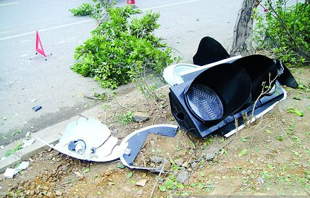 撞斷燈桿后,紅綠燈殘片散落地上