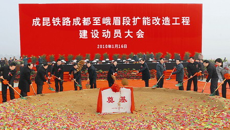 省委書記、省人大常委會主任劉奇葆出席開工儀式,并宣布成昆鐵路新線成都至峨眉段工程開工。省委副書記、省長蔣巨峰出席開工儀式并講話。劉奇葆、蔣巨峰和鐵道部副部長胡亞東等共同為工程奠基。