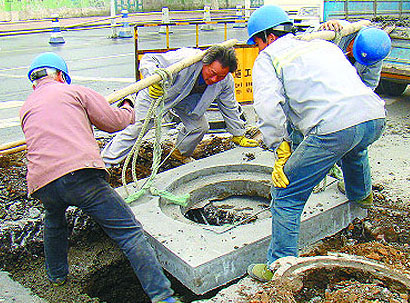 28日下午,杭州市市政所對南環路與通惠路交叉口一雨水井進行改進試驗,這口井附近瀝青有龜裂,井面略有沉降。工人們將井蓋挪開,敲碎井口周圍的混凝土后,將已經變形的井圈取出。“城區的雨水井都是井口澆一圈混凝土,再放下井座裝上井蓋。”杭州市市政所負責人姚先生告訴記者,這次與以往不同的是,要在井口新裝一塊重達200多公斤的鋼筋混凝土井板,它承受重車碾壓能力很強,可極大減緩雨水井沉降速度。