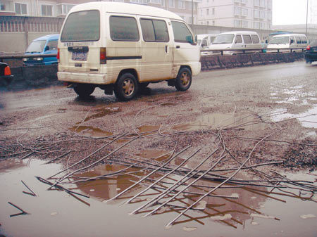 從騰飛街上到二環橋上,往東行駛不到200米,就發現通過這里的機動車紛紛在橋面上扭起了“秧歌”,使這段路面顯得很“喜慶”,原來這里到處都是汪著污水的大坑,有的坑甚至有2米長。最大的一個坑里,竟然還支出了數十根鋼筋,一些較細、較軟的鋼筋甚至像鐵絲網一樣盤旋著。