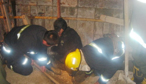 鐵模坑寬度僅有20多厘米,深約1米,救援空間極為狹小,消防官兵進入后根本無法轉動身體,更無法使用大型救援器材。這時工人說,他的右腿被鐵模卡住了,因為疼痛,體力有點受不了了。聞訊,消防兵立即找來一塊石板讓工人作支撐物節省體力。此時,因為受到驚嚇和寒冷侵襲,工人表情極為痛苦。見狀,副班長山其坤,戰斗員曲斌、韓東、劉少華輪番上陣使用鐵锨、消防鎬等工具對被困人員周圍土地進行挖掘。但由于最近天氣寒冷導致周圍土層凍得非常堅硬,加之地底下全是些大大小小的碎石,救援一度受阻。而此時,隨著天色越來越暗,鐵锨、消防鎬的施工,也給被困工人帶來危險。半個多小時后,救援工作進展不大。