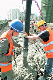 云南路主線高架共有6聯主橋。昨天開始澆筑的是云南路主線高架1號橋,也是最緊鄰快速路三期的一聯橋。記者上午11點趕到作業現場,工人們正在進行第3層混凝土澆筑。4名工人引導兩臺泵車通過導管向箱梁澆筑混凝土,流出的混凝土被工人迅速導入箱梁中,隨后再被振搗機均勻下引,確保澆筑的密實度。據項目相關負責人介紹,整個澆筑作業分6層進行,每層澆筑混凝土30-40厘米,24小時將澆筑混凝土1280立方米。作業完成后,箱梁厚度將達到2米。
