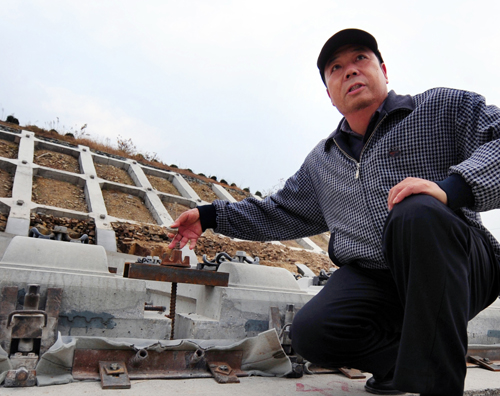 石武客專中鐵十六局二分部項目常務副經理孫成聚介紹他自行設計的軌道板扣壓裝置