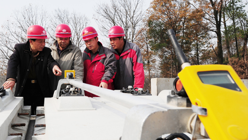 石武客專中鐵十六局二分部項目黨工委書記柯火金(左一)項目常務副經理孫成聚(左二)項目總工程師楊浩(右二) 精測隊長宋振江查看軌道板精調數據