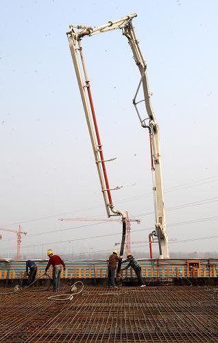 2月20日,建筑工人在鄭州新東站工地澆筑混凝土。