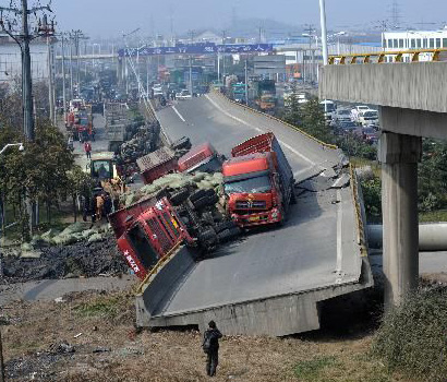 2月21日,坍塌事故現場。當天凌晨,浙江省上虞市境內的春暉立交橋發生引橋坍塌,坍塌總長度120米,最高落差7米。事故造成引橋上4輛貨車側翻,3人輕微傷,事故具體原因正在調查之中。