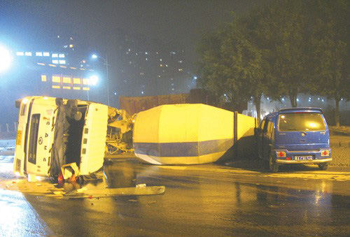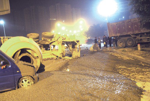 當晚11時左右,記者在現場看到,一輛攪拌車側翻在白云鳳嶺路口中間,擋風玻璃被撞得完全破碎,已破損的油箱大量溢出柴油。混凝土攪拌大滾筒與車身已經脫離,滾出兩三米遠。大滾筒倒料口抵著一輛綠色小汽車的車頭左側。小車車頭被撞得凹陷。地面到處撒滿混凝土,小車前輪幾乎被掩埋。在現場人行道上,一輛泥車頭的車頭頂在一棵大樹根部,車頭被撞得破碎。一個滿臉鮮血的男子坐在路邊痛苦地呻吟。不一會兒,一輛救護車趕來,將受傷男子送往醫院。
