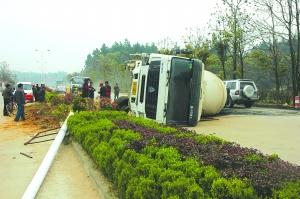 4月19日17時許,上饒上廣公路一輛混凝土攪拌車撞上綠化隔離帶后,發生側翻。攪拌車上裝載的水泥散落一地,所幸無人員受傷。