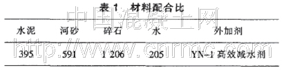 (2)外加劑 : 采用徐州宜楊建材廠生產的YN-1高效減水劑。其主要成份是卜蔡磺酸鈉鹽甲醛縮合物,摻量為水泥質量的2%,含固量為38%.